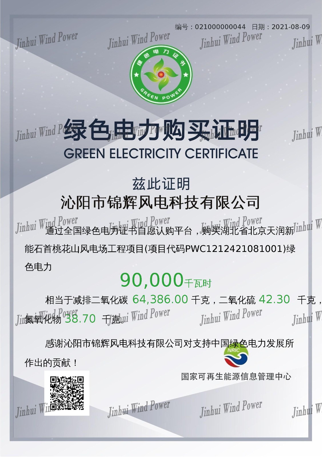 今天我公司正式啟用綠電,開(kāi)展光伏、風(fēng)力發(fā)電的電量交易,實(shí)現(xiàn)用電零碳排放的目標(biāo)。在2020.8-2021.7公司總使用電量584541度,綠電使用90000度,使用率是15.4%,綠電全部用于金風(fēng)產(chǎn)品的生產(chǎn)制造過(guò)程,公司承諾5年內(nèi)綠電使用率達(dá)到100%。